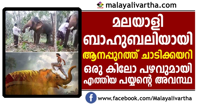 പ്രഭാസിനെയും രാജമൗലിയെയും മനസില് ധ്യാനിച്ച് കൊമ്പന്റെ മുമ്പിലേക്ക്... ആനപ്പുറത്ത് കയറി നിന്ന് ബാഹുബലിയിലെ രംഗം ജീവിതത്തിലേക്ക് പകര്ത്താന് ശ്രമിച്ച യുവാവിന് എട്ടിന്റെ പണി