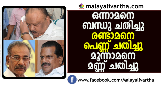 കണ്ണീര് കായലിലാണോ തോമാച്ചന്റെ രാജീ.. അലയും കാറ്റിലുലയും രണ്ടു ഗ്രൂപ്പും വേറെ വേറെ. മനസിലെ ഭാരം പങ്ക് വെക്കാനായി കൂട്ടീന്നൊരാളും കൂടെ വേറെ. ചാണ്ടി കാലുതെറ്റി കായലില് വീണു. രക്ഷിക്കുവാന് ശ്രമിച്ച പിണറായിക്കും പരിക്ക് പറ്റി.