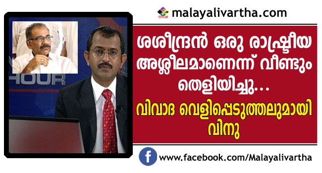 എ.കെ. ശശീന്ദ്രന് ഒരു രാഷ്ട്രീയ അശ്ലീലമാണെന്ന് വീണ്ടും തെളിയിച്ചുവെന്നും ചാനലില്നിന്ന് പലതവണ അങ്ങോട്ട് വിളിച്ചിട്ടും ഫോണെടുക്കാതിരുന്ന ശശീന്ദ്രന് ചാണ്ടിയുടെ രാജിക്ക് പിന്നാലെ നിരവധി തവണ ഫോണ് വിളിച്ചുവെന്നും താന് എടുക്കാതായപ്പോള് ഇങ്ങനെ സന്ദേശം അയച്ചുവെന്നുമാണ് വിനുവിന്റെ ആരോപണം.