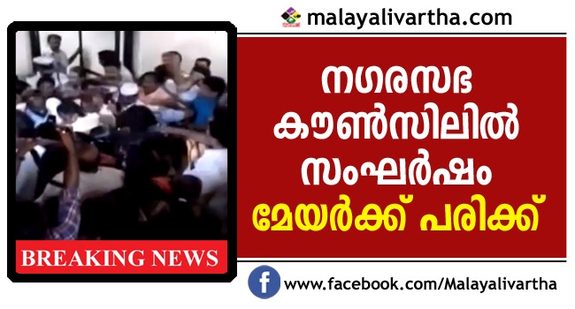 പ്രത്യേക കൗണ്സില് യോഗത്തിനിടെ നഗരത്തിലെ ഹൈമാസ്ക് ലൈറ്റുകളെക്കുറിച്ചുള്ള ചര്ച്ചയ്ക്കിടെയാണ് സി.പി.എം ബി.ജെ.പി കൗണ്സിലര്മാര് തമ്മില് ഉന്തുംതള്ളുമുണ്ടായത്. ഇതിനിടയിലാണ് മേയര്ക്ക് പരിക്കേറ്റത്. മേയറെ ബി.ജെ.പിക്കാര് കൈയ്യേറ്റം ചെയ്തതാണെന്ന് സി.പി.എം ആരോപിച്ചു. കൗണ്സില് യോഗം കഴിഞ്ഞ് പുറത്തേക്കിറങ്ങിയ മേയറെ ബി.ജെ.പിക്കാര് പിന്തുടര്ന്ന് ആക്രമിക്കുകയായിരുന്നുവെന്നും ഇടതു കൗണ്സിലര്മാര് ആരോപിക്കുന്നു. എന്നാല് മേയറെ ആക്രമിച്ചിട്ടില്ലെന്ന് ബി.ജെ.പി നേതാക്കള് അറിയിച്ചു.