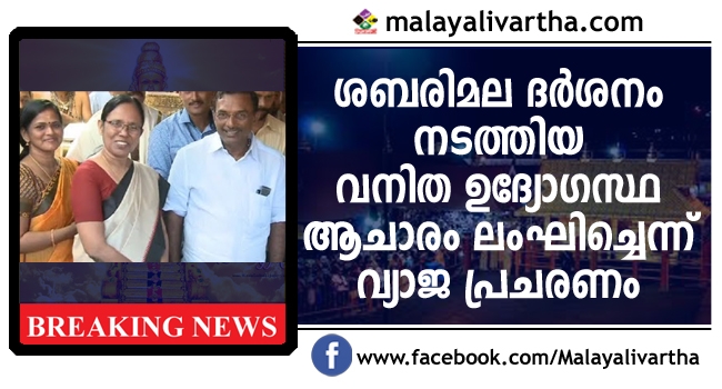 മന്ത്രി കെ കെ ശൈലജയ്ക്കൊപ്പം ശബരിമല സന്നിധാനത്ത് ദര്ശനം നടത്തിയ വനിത ഉദ്യോഗസ്ഥ ആചാരം ലംഘിച്ചെന്ന് സമൂഹമാധ്യമങ്ങളില് വ്യാജ പ്രചരണം. നാഷണല് ഹെല്ത്ത് മിഷന് ചീഫ് എന്ജിനീയറായ സി ജെ അനില ഇതിനെതിരെ മുഖ്യമന്ത്രിക്ക് പരാതി നല്കി.
