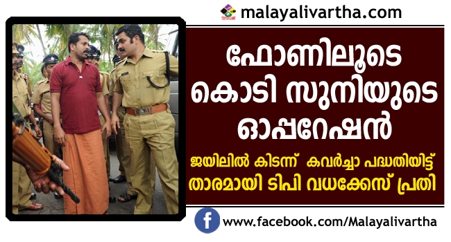 വിയ്യൂര് സെന്ട്രല് ജയിലിരുന്ന് ടി.പി. ചന്ദ്രശേഖരന് വധക്കേസ് പ്രതി കൊടി സുനി കവര്ച്ച ആസൂത്രണംചെയ്ത് നടപ്പാക്കി. ടി.പി. വധക്കേസില് ജീവപര്യന്തം തടവനുഭവിക്കുന്ന കൊടി സുനി ജയിലില് അടിപളി ജീവതമാണ് നയിക്കുന്നത്. ഫോണ് വിളിയും ഫെയ്സ് ബുക്ക് ഉപയോഗത്തിനും ഒപ്പമാണ് മോഷണവും ജയിലില് ഇരുന്ന് സുനി നടത്തിയെന്ന് അന്വേഷണ സംഘം. കോഴിക്കോട്ട് കാര് യാത്രക്കാരനെ ആക്രമിച്ച് മൂന്ന് കിലോഗ്രാം കള്ളക്കടത്ത് സ്വര്ണം കവര്ന്നെന്നാണ് കേസ്.