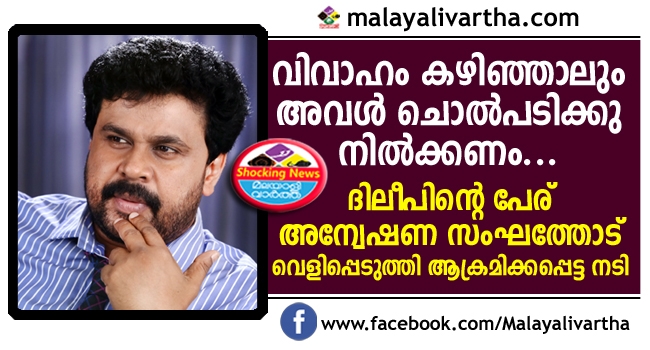 ‘വിവാഹം കഴിഞ്ഞാലും അവൾ ചൊൽപടിക്കു നിൽക്കണം.’ യുവനടിയെ തട്ടിക്കൊണ്ടു പോയി അപകീർത്തിപ്പെടുത്തുന്ന ചിത്രങ്ങൾ പകർത്താനുള്ള ക്വട്ടേഷൻ നൽകുമ്പോൾ നടൻ ദിലീപ് ഒന്നാംപ്രതി സുനിൽകുമാറിനോടു പറഞ്ഞത് ഇങ്ങനെയെന്നു കുറ്റപത്രത്തിൽ. അതിനായി ഒരേസമയം നടി പലരുമായി ഇടപഴകുന്നതിന്റെ ദൃശ്യങ്ങളാണു സുനിലിനോടു പകർത്താൻ നിർദേശിച്ചിരുന്നത്. നടിയുടെ മോതിരം വ്യക്തമായി ദൃശ്യങ്ങളിൽ കാണണമെന്നും നിർദേശിച്ചിരുന്നു. സംഭവദിവസം നടി ധരിച്ചിരുന്നതു പ്രതിശ്രുത വരൻ സമ്മാനിച്ച മോതിരമാണെന്ന ധരണയിലാണ് ഇക്കാര്യം നിർദേശിച്ചതെന്നാണു പൊലീസിന്റെ നിഗമനം. ദിലീപിന്റെ ആദ്യവിവാഹം തകരാനിടയാക്കിയ സംഭവങ്ങളിൽ ഉപദ്രവിക്കപ്പെട്ട യുവനടിക്കു മുഖ്യപങ്കുണ്ടെന്ന ധാരണയാണ് ഇവരോടു കടുത്ത പകയുണ്ടാവാൻ വഴിയൊരുക്കിയത്.