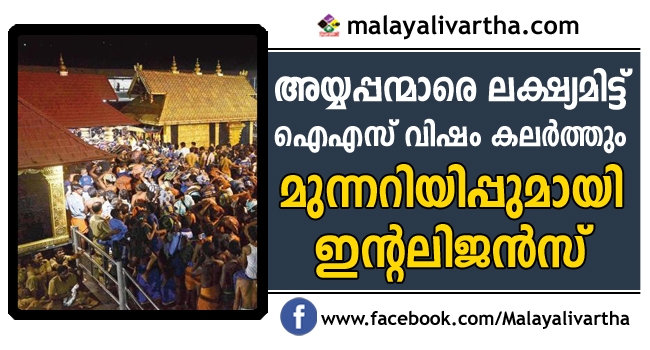 ട്രെയിനില് സഞ്ചരിക്കുന്ന ശബരിമല തീര്ത്ഥാടകരെ ലക്ഷ്യമിട്ട് ഐ.എസ്. ഭീകരര് കുടിവെള്ളത്തില് വിഷം കലര്ത്താന് സാധ്യതയുണ്ടെന്ന് ഇന്റലിജന്സ് റിപ്പോര്ട്ട്. ട്രെയിനുകളിലും റെയില്വേ സ്റ്റേഷനുകളിലും റെയില്വേ പോലീസ് സുരക്ഷ ശക്തമാക്കി. സ്റ്റേഷന് മാസ്റ്റര്മാര്ക്കു ജാഗ്രതാ നിര്ദേശം നല്കി. കൂട്ടമായെത്തുന്ന മുസ്ലിംകളല്ലാത്ത യാത്രക്കാര്ക്ക് കുടിക്കാനായി റെയില്വേ സ്റ്റേഷനുകളിലും ട്രെയിനുകളിലും നല്കുന്ന വെള്ളത്തില് വിഷം കലര്ത്താന് ഐ.എസ്. പദ്ധതിയുണ്ടെന്ന രഹസ്യാന്വേഷണ റിപ്പോര്ട്ടിനെപ്പറ്റി റെയില്വേ പോലീസ് സ്റ്റേഷന് മാസ്റ്റര്മാര്ക്കു വിവരം നല്കിയിട്ടുണ്ട്.