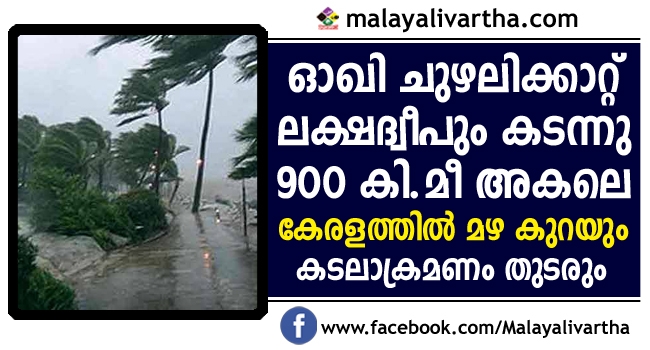 തമിഴ്നാട്, കേരളം, ലക്ഷദ്വീപ് എന്നിവിടങ്ങളില് വന്നാശനഷ്ടം വിതച്ച ഓഖി ചുഴലിക്കാറ്റ് ലക്ഷദ്വീപും കടന്നു പോയി. നിലവില് കേരളതീരത്ത് നിന്ന് 900 കി.മീ അകലെയുള്ള ഓഖി ചുഴലിക്കാറ്റ് ഇപ്പോള് ഗുജറാത്ത് തീരം ലക്ഷ്യമാക്കി നീങ്ങുകയാണ്.