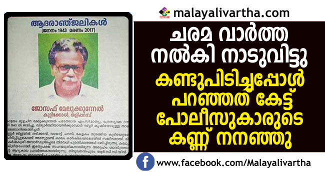പ്രമുഖ പത്രങ്ങളില് ചരമവാര്ത്തയും പരസ്യവും നല്കിയ ശേഷം അപ്രത്യക്ഷനായ കര്ഷകനെ കണ്ടെത്തിയപ്പോള് പറയാനുള്ളത് മറ്റൊന്ന്. തളിപ്പറമ്പ് കുറ്റിക്കോല് സ്വദേശി ജോസഫ് മേലുക്കുന്നേലിനെ കോട്ടയത്ത് നിന്നാണ് കണ്ടെത്തിയത്.