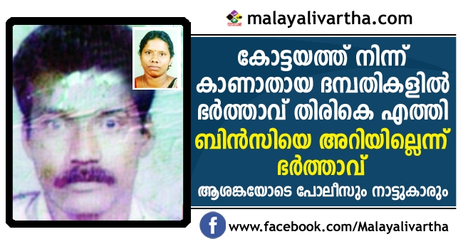 കോട്ടയം കുഴിമറ്റത്തു നിന്നു കാണാതായ ദമ്പതികളില് ഭര്ത്താവു തിരികെ എത്തി; ഭാര്യ എവിടെ എന്ന് അറിയില്ലന്നു ഭര്ത്താവ്; ബിന്സിക്കു വേണ്ടിയുള്ള തെരച്ചില് ശക്തമാക്കി പോലീസ്