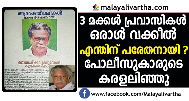 ഭാര്യ വീട്ടമ്മ. മൂന്ന് മക്കള് പ്രവാസികള്. ഒരാള് വക്കീല്. എല്ലാവരും ഉണ്ടായിട്ടെന്താ ഈ വയസാം കാലത്ത് വീട്ടുകാരെ വിഷമിപ്പിച്ച തളിപ്പറമ്പ് കുറ്റിക്കോല് മേലുകുന്നേല് ജോസഫിന് (75) പറയാനുള്ളത് കരളലിയിപ്പിക്കുന്ന കഥകള്. ദിനപത്രങ്ങളില് സ്വന്തം ചരമവാര്ത്തയും പരസ്യവും നല്കി ജോസഫിനെ കോട്ടയത്തു കണ്ടെത്തി. തിങ്കളാഴ്ച കോട്ടയത്തെ കാര്ഷിക വികസന ബാങ്കില് ചെന്നിരുന്നെന്നറിഞ്ഞു നടത്തിയ തെരച്ചിലില് ഇന്നലെ പുലര്ച്ചെ നഗരമധ്യത്തില് തിരുനക്കര ക്ഷേത്രത്തിനു സമീപമുള്ള ഐശ്വര്യ ലോഡ്ജിലാണ് പോലീസ് അദ്ദേഹത്തെ കണ്ടെത്തിയത്. വൈകുന്നേരത്തോടെ തളിപ്പറമ്പില്നിന്നെത്തിയ ബന്ധുക്കള്ക്കും പോലീസിനുമൊപ്പം വിട്ടയച്ചു.