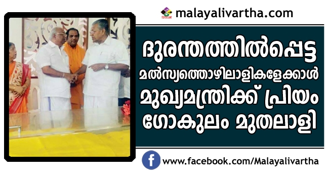 ഓഖി ദുരിതത്തില്പെട്ട മല്സ്യത്തൊഴിലാളികളെയും കുടുംബങ്ങളെയും സന്ദര്ശിക്കാന് ആദ്യം മടികാണിച്ച മുഖ്യമന്ത്രി പിണറായി വിജയന് ശതകോടീശ്വരനായ ഗോകുലം ഗോപാലന്റെ അച്ഛന് ഗോകുലം ചാത്തു മരിച്ചപ്പോള് ഓടിയെത്തി. സെക്രട്ടറിയേറ്റില് നിന്ന് 15 കിലോമീറ്റര് ദൂരെയുള്ള ഗോകുലം മെഡിക്കല് കോളജിലായിരുന്നു മരിച്ച ചാത്തുവിന്റെ മൃതദ്ദേഹം സൂക്ഷിച്ചിരുന്നത്. ഭാര്യ കമലയേയും കൂട്ടിയാണ് മുഖ്യമന്ത്രി മുതലാളിയെ ആശ്വസിപ്പിക്കാന് ചെന്നത്. സോഷ്യല് മീഡിയയിലടക്കം ഇതിനെതിരെ വ്യാപകപ്രതിഷേധമാണ് ഉയരുന്നത്.