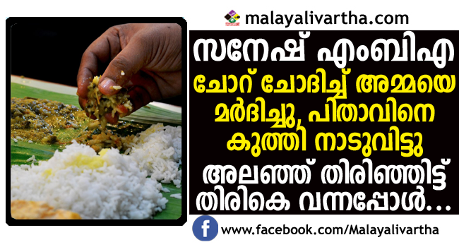 ഒരച്ഛനോടും അമ്മയോടും ചെയ്യാന് പാടില്ലാത്ത കുറ്റമാണ് പത്തനംതിട്ട വള്ളിക്കോട് കുറന്തല്ക്കടവ് കത്തുവേലിപ്പടിക്ക് സമീപം മായാലില് കൊട്ടാരത്തില് സനേഷ് (32) ചെയ്തത്. ചോറ് ചോദിച്ച് മാതാവിനെ കയ്യേറ്റം ചെയ്യുകയും അത് ചോദിക്കാനെത്തിയ പിതാവിനെ കുത്തി പരിക്കേല്പ്പിക്കുകയും ചെയ്ത ശേഷം മുംബൈയ്ക്ക് ജോലി തേടിപ്പോയ എംബിഎക്കാരന് യുവാവിനെ ജോലി കിട്ടാതെ മടങ്ങി വരും വഴി പിതാവിനെ കൊല ചെയ്തതിന് അറസ്റ്റ് ചെയ്തു. പിതാവ് മരിച്ചതറിയാതെ നാട്ടിലേക്ക് മടങ്ങിയെത്തിയ സനേഷിനെ വണ്ടിയിറങ്ങി വീട്ടിലേക്ക് വരുമ്പോള് പോലീസ് പിടികൂടുകയായിരുന്നു.