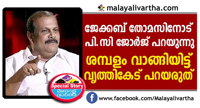 സംസ്ഥാനത്ത് നിയമവാഴ്ച തകര്ന്നെന്ന് പരസ്യമായി ആരോപിച്ച മുന് വിജിലന്സ് ഡയറക്ടറും ഐ.എം.ജി. മേധാവിയുമായ ജേക്കബ് തോമസിനെ സര്ക്കാര് സസ്പെന്ഡ് ചെയ്തതിനെ തുടര്ന്ന് മാതൃഭൂമിന്യൂസില് നടന്ന ചര്ച്ചയില് പൂഞ്ഞാര് എം.എല്.എ പി.സി ജോര്ജ് ജേക്കബ്തോമസിന്റെ നിരുത്തരവാദപരമായ പ്രസ്താവനകള്ക്കും നിലപാടുകള്ക്കും എതിരെ ആഞ്ഞടിച്ചു. ഇത് സോഷ്യല്മീഡിയയില് വലിയ ചര്ച്ചയായിരിക്കുകയാണ്. ഒപ്പം പി.സിയുടെ സംഭാഷണങ്ങള് യുട്യൂബില് വൈറലുമായി.