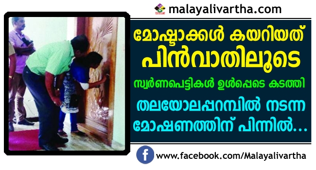 ഉള്ളില് കടക്കാനായി പിന്വാതില് തുറക്കാന് ചെന്നപ്പോള് വാതിലും ഷട്ടറും തുറന്നുകിടക്കുന്നതാണു കണ്ടത്. മുന്വാതിലിന്റെ വിലപിടിപ്പുള്ള പൂട്ട് തുറന്നെങ്കിലും അകത്ത് ഇരുമ്പ് പട്ട കൊണ്ടു നിര്മിച്ച കൊളുത്ത് ഇട്ടിരുന്നതിനാള് തുറക്കാനാവാതെ വന്നതോടെയാണ് പിന്വാതിലുകളുടെ താഴുകള് തകര്ത്ത് മോഷ്ടാവ് അകത്തുകടന്നത്. വീട്ടിനുള്ളില് പരിശോധിച്ചപ്പോഴാണ് അലമാരയില് ആഭരണങ്ങള് സൂക്ഷിച്ചിരുന്ന പെട്ടി നഷ്ടപ്പെട്ടന്നു മനസിലായത്.