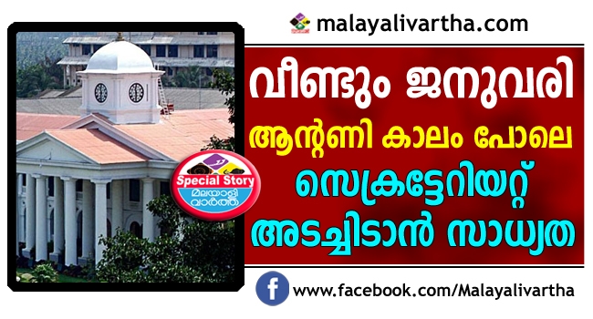 സി പി എം, സി പി ഐ അനുകൂല സർവീസ് സംഘടനകൾ സമര രംഗത്തിറങ്ങുന്നതോടെ ജനുവരിയിൽ തിരുവനന്തപുരം സെക്രട്ടേറിയറ്റ് അനിശ്ചിതകാലത്തേക്ക് അടച്ചിടാൻ സാധ്യത. ഇതുപോലൊരു ജനുവരിയിലാണ് പണ്ട് ആന്റണി സർക്കാരിന്റെ കാലത്ത് ജീവനക്കാർ കൂട്ടത്തോടെ പണിമുടക്കിയത്.