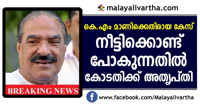 മുന്മന്ത്രി കെ.എം മാണിക്കെതിരായ ബാര്ക്കോഴക്കേസ് അന്വേഷണം നീണ്ടുപോകുന്നതില് കോടതി അതൃപ്തി രേഖപ്പെടുത്തി. തിരുവനന്തപുരം വിജിലന്സ് കോടതിയാണ് അതൃപ്തി രേഖപ്പെടുത്തിയത്. അന്വേഷണത്തിന് അവസാനമില്ലേ എന്ന് കോടതി ചോദിച്ചു. കേരളാ കോണ്ഗ്രസിന്റെ മുന്നണി പ്രവേശനം സംബന്ധിച്ച നിലപാട് വ്യക്തമാക്കുന്നതിന്റെ ഭാഗമായാണ് കേസ് നീട്ടിക്കൊണ്ട് പോകുന്നതെന്ന് രാഷ്ട്രീയനിരീക്ഷകര് വിലയിരുത്തുന്നു. എല്.ഡി.എഫ് പ്രവേശനം പ്രഖ്യാപിച്ചാല് കേസ് തീര്ക്കാമെന്ന നിലപാടിലാണ് മുന്നണിനേതൃത്വം. കേസ് അവസാനിപ്പിച്ച ശേഷം പഴയ ലാവണത്തിലേക്ക് കേരളാ കോണ്ഗ്രസ് പോകുമോ എന്ന ആശങ്ക എല്.ഡിഎഫിനുണ്ട്.