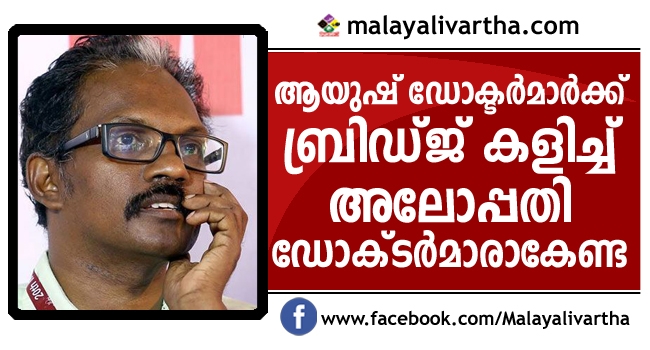 അതുകൊണ്ട് ആയുഷ് ഡോക്ടര്മാര്ക്ക് ബ്രിഡ്ജ് കളിച്ചു അലോപ്പതി ഡോക്ടര്മാരാകാനാണ് ഈ സര്ക്കാര് നീക്കമെന്ന് കരുതി ഹോമിയോപ്പതിയെയും ആയൂര്വേദത്തെയും കളിയാക്കാനായി പോസ്റ്റുമായി കുറച്ച് ആളുകള് സോഷ്യല് മീഡിയയില് ഇറങ്ങിയിട്ടുണ്ട്. ആയുഷ് ഡോക്ടര്മാര്ക്ക് അലോപ്പതി ചെയ്യണമെന്ന് യാതൊരു താല്പര്യവുമില്ല. അലോപ്പതി വേണ്ടെന്ന് വെച്ചിട്ടാണ് അവര് ആയുഷ് പഠിക്കാന് ഇറങ്ങിയത് . അവരുടെ അടുത്തെത്തുന്ന രോഗികളും ആയുഷ് ചികിത്സയ്ക്കാണ് എത്തുന്നത്. ഈ ബ്രിഡ്ജ് കോഴ്സ് വേണ്ട എന്ന് വാദിക്കുന്നതും ഇതിനെ ശക്തമായി എതിര്ക്കുന്നതും ആയുഷ് ഡോക്ടര്മാരാണ്. ഈ വിഷയത്തില് ഐ എം എ യോടൊപ്പമാണ് ആയുഷ് ഡോക്ടര്മാരും.