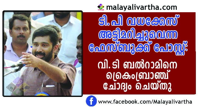 ടി.പി ചന്ദ്രശേഖരന് വധക്കേസില് അന്വേഷണം അട്ടിമറിച്ചുവെന്ന ഫേസ്ബുക്ക് പോസ്റ്റില് ബി.ടി ബല്റാം എം.എല്.എയെ ക്രൈംബ്രാഞ്ച് ചോദ്യം ചെയ്തു ;ചോദ്യം ചെയ്യല് പാലക്കാട് ബി.ജെ.പി ജില്ലാ സെക്രട്ടറി നല്കിയ പരാതിയിൽ