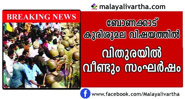 ബോണക്കാട് കുരിശുമലയില് തീര്ഥാടനം അനുവദിക്കാത്തതിനെ തുടര്ന്നു വിശ്വാസികള് വിതുരയില് റോഡ് ഉപരോധിച്ചു നടത്തിയ പ്രതിഷേധത്തില് സംഘര്ഷം. റോഡ് ഉപരോധിച്ച വിശ്വാസികള്ക്കു നേരെ പോലീസ് ലാത്തി വീശി. സ്ത്രീകള് ഉള്പ്പെടെയുള്ളവര്ക്ക് പരിക്കേറ്റു.