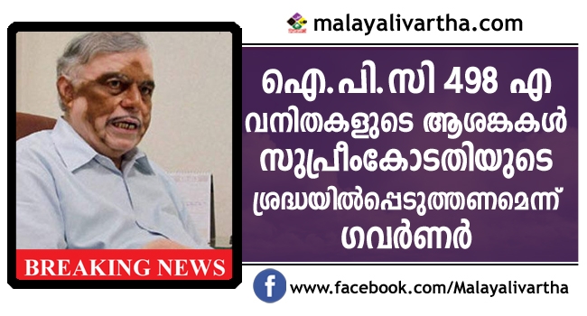 ഐ. പി. സി 498 എ യുമായി ബന്ധപ്പെട്ടുള്ള വിധിയില് സ്ത്രീകളുടെ ആശങ്കകള് സുപ്രീംകോടതിയുടെ ശ്രദ്ധയില്പെടുത്താന് സംസ്ഥാന വനിതാ കമ്മീഷന് മുന്കൈയെടുക്കണമെന്ന് ഗവര്ണര് പി. സദാശിവം പറഞ്ഞു. സംസ്ഥാന വനിതാ കമ്മീഷന് വി. ജെ. ടി ഹാളില് സംഘടിപ്പിച്ച ഐ. പി. സി 498 എയുമായി ബന്ധപ്പെട്ടുള്ള സുപ്രീംകോടതി വിധിയും അനന്തര ഫലവും എന്ന സെമിനാര് ഉദ്ഘാടനം ചെയ്യുകയായിരുന്നു അദ്ദേഹം. സുപ്രീം കോടതിയുടെ വിധിക്കെതിരെ ഒരു സംഘടന സുപ്രീം കോടതി ചീഫ് ജസ്റ്റിസ് ഉള്പ്പെടുന്ന ബെഞ്ചിനെ സമീപിച്ചിട്ടുണ്ട്. വനിതാ കമ്മീഷന് ഈ കേസില് കക്ഷി ചേരാവുന്നതാണ്. ദേശീയ വനിതാ കമ്മീഷന് മുഖേന പ്രശ്നങ്ങള് സുപ്രീം കോടതി മുമ്പാകെ അവതരിപ്പിക്കാവുന്നതാണെന്നും ഗവര്ണര് നിര്ദ്ദേശിച്ചു.