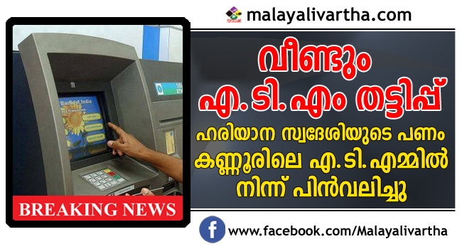 രണ്ട് യുവാക്കള് ചേര്ന്ന് എ.ടിയഎമ്മില് നിന്ന് പണം പിന്വലിക്കുന്ന ദൃശ്യങ്ങള് ലഭിച്ചിട്ടുണ്ടെന്ന് പൊലീസ് അറിയിച്ചു, അടുത്തകാലത്തായി എ.ടി.എം തട്ടിപ്പ് സംസ്ഥാനത്ത് വര്ദ്ധിച്ചുവരുകയാണ്