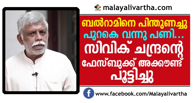 എകെജിക്കെതിരായ പരാമര്ശത്തില് വി.ടി ബല്റാം എംഎല്എയെ പിന്തുണച്ച സിവിക് ചന്ദ്രന്റെ ഫേസ്ബുക്ക് അക്കൗണ്ട് അപ്രത്യക്ഷം
