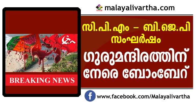 സി.പി.എം- ബി.ജെ.പി സംഘര്ഷം പതിവായ കണ്ണൂര് തലശേരി ധര്മടത്ത് ആര്എസ്എസ് സേവാകേന്ദ്രത്തിന് നേരേ ബോംബാക്രമണം. ഞായറാഴ്ച രാത്രിയാണ് ധര്മടം സത്രത്തിന് സമീപം പ്രവര്ത്തിക്കുന്ന ആര്എസ്എസ് സേവാകേന്ദ്രമായ ഗുരുമന്ദിരത്തിന് നേരേയാണ് ബോംബേറുണ്ടായത്. ശനിയാഴ്ച രാത്രി സിപിഎം ഓഫീസിനുനേരേ നടന്ന അക്രമത്തിന്റെ തുടര്ച്ചയാണ് ആര്എസ്എസ് സേവാകേന്ദ്രത്തിന് നേരേയുണ്ടായ ബോംബാക്രമണം. ആക്രമണത്തില് സ്ഥാപനത്തിന്റെ ബോര്ഡും കൈവരികളും തകര്ന്നിട്ടുണ്ട്. ധര്മടം പൊലീസ് സ്ഥലത്തെത്തി പരിശോധന നടത്തി. അക്രമത്തിന് പിന്നില് സിപിഎമ്മാണെന്നു ആര്എസ്എസ് ആരോപിച്ചു.
