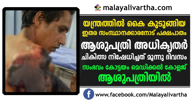 മൂവാറ്റുപുഴ ചാലിക്കടവ് പാലത്തിന് സമീപം റോഡരികില് കരിമ്പ് ജ്യൂസ് കട നടത്തുന്ന മഹാരാഷ്ട്ര സ്വദേശി വജീര് തജ്മല് ഖാനെന്ന 27 കാരനാണ് ആശുപത്രി അധികൃതർ ചികിത്സ നിഷേധിച്ചത്. കഴിഞ്ഞ വ്യാഴാഴ്ചയാണ് ഇയാളുടെ വലതു കൈയുടെ തോള് മുതല് താഴത്തേക്കുള്ള ഭാഗം യന്ത്രത്തില് കുടുങ്ങിയത്. ജ്യൂസ് ഉണ്ടാക്കുന്നതിനിടെ കാല് വഴുതി യന്ത്രത്തിൽ വീഴുകയായിരുന്നു. ഉടൻ തന്നെ നാട്ടുകാര് കോലഞ്ചേരി മെഡിക്കല് കോളജ് ആശുപത്രിയില് എത്തിച്ചെങ്കിലും നാല് ലക്ഷത്തോളം രൂപ ചെലവ് വരുമെന്നറിയിച്ചതോടെ പ്രഥമ ശുശ്രൂഷ നല്കിയശേഷം കോട്ടയം മെഡിക്കല് കോളജ് ആശുപത്രിയിലേക്ക് കൊണ്ടുപോയി. എന്നാൽ മെഡിക്കല് കോളജ് ആശുപത്രിയില് ഇയാളെ അഡ്മിറ്റ് ചെയ്തുവെങ്കിലും ചികിത്സ നല്കിയിരുന്നില്ല.