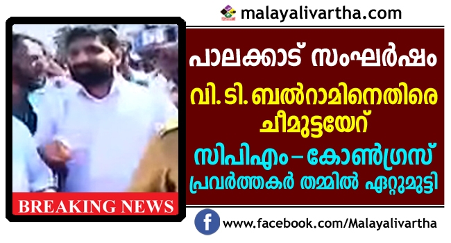 എകെജിക്കെതിരായ വിവാദ പരാമര്ശത്തില് തൃത്താലയില് വി.ടി. ബല്റാം എംഎല്എയ്ക്കെതിരെ സിപിഎം പ്രതിഷേധം. തൃത്താലയില് ഒരു പൊതുപരിപാടിയില് പങ്കെടുക്കാന് എത്തിയപ്പോഴാണ് സിപിഎം പ്രവര്ത്തകരുടെ പ്രതിഷേധം. പ്രവര്ത്തകര് എംഎല്എയ്ക്കു നേരെ ചീമുട്ടയേറിഞ്ഞു. തുടര്ന്നു പ്രദേശത്ത് കോണ്ഗ്രസ്സിപിഎം പ്രവര്ത്തകര് തമ്മില് ഏറ്റുമുട്ടി.
