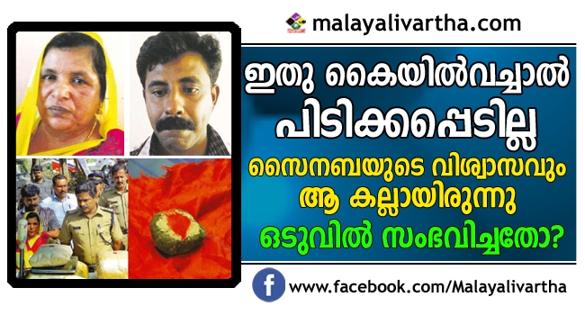 കഞ്ചാവുവേട്ടയില് അറസ്റ്റിലായ സൈനബക്കു നല്കിയ വിശ്വാസമായിരുന്നു ആ കല്ല്. തമിഴ്നാട്ടില് പൊള്ളാച്ചി-പഴനി ഭാഗങ്ങളില്നിന്നും കഞ്ചാവുവാങ്ങി കൊണ്ടുവരുമ്പോഴാണ് പട്ടില് പൊതിഞ്ഞ പൂജിച്ച കല്ല് നല്കുന്നത്.