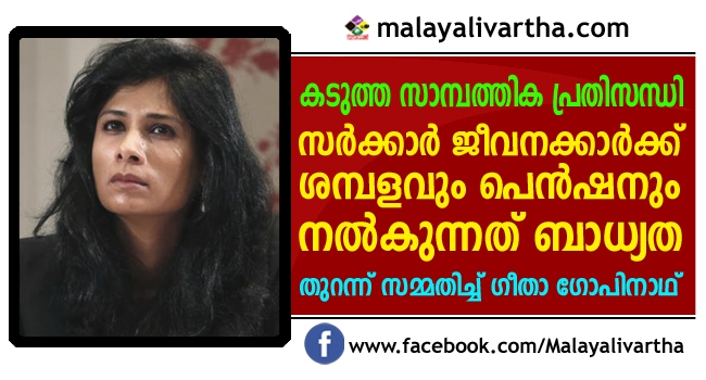 സംസ്ഥാനത്ത് കടുത്ത സാമ്പത്തിക പ്രതിസന്ധിയുണ്ടെന്ന് മുഖ്യമന്ത്രിയുടെ സാമ്പത്തിക ഉപദേഷ്ടാവ് ഗീതാ ഗോപിനാഥ്. സര്ക്കാര് ജീവനക്കാര്ക്ക് ശമ്പളവും പെന്ഷനും നല്കുന്നത് ബാധ്യതയായിരിക്കുകയാണെന്നും, സാമ്പത്തിക നില മെച്ചപ്പെടുത്താന് സ്വകാര്യ മേഖലയ്ക്ക് കൂടുതല് പ്രാധാന്യം നല്കണമെന്നും ഗീതാ ഗോപിനാഥ് വ്യക്തമാക്കി.
