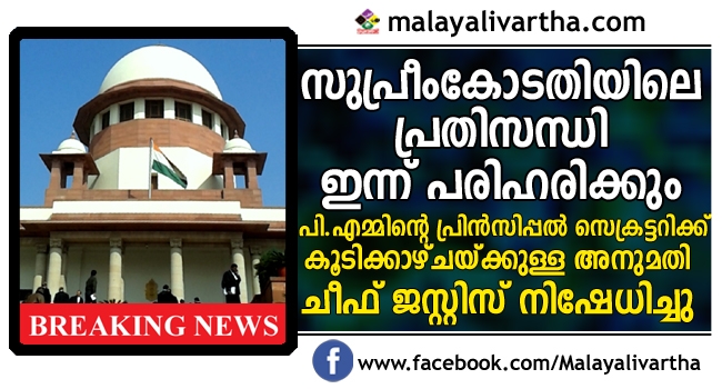 സുപ്രീംകോടതിയിലെ പ്രതിസന്ധികള്ക്കിടെ ചീഫ് ജസ്റ്റിസ് ദീപക് മിശ്രയെ കാണാന് ഔദ്യോഗിക വസതിയിലെത്തിയ, പ്രധാനമന്ത്രിയുടെ പ്രിന്സിപ്പല് സെക്രട്ടറി നൃപേന്ദ്ര മിശ്രയെ കാണാന് അദ്ദേഹം കൂട്ടാക്കിയില്ല. ഇതോടെ അദ്ദേഹം തിരികെ മടങ്ങി. ജുഡീഷ്യറിയിലെ സ്തംഭവാനവസ്ഥയില് കേന്ദ്രസര്ക്കാരും ജനങ്ങളും ആശങ്കയിലാണ്. ജുഡീഷ്യറിയിലെ തര്ക്കത്തില് ഇടപെടണ്ട എന്ന നിലപാടാണ് കേന്ദ്രസര്ക്കാര് ആദ്യം സ്വീകരിച്ചത്. പ്രശ്നം ഇന്ന് പരിഹരിക്കാനാകുമെന്ന് അറ്റോര്ണി ജനറല് കെ.കെ വേണുഗോപാല് സൂചിപ്പിച്ചു. ചീഫ് ജസ്റ്റിസിന് തൊട്ട് താഴെയുള്ള നാല് ജഡ്ജിമാരാണ് സുപ്രീംകോടതിയിലെ കെടുകാര്യസ്ഥതയ്ക്കെതിരെ മാധ്യമങ്ങള്ക്ക് മുന്നിലെത്തിയത്.