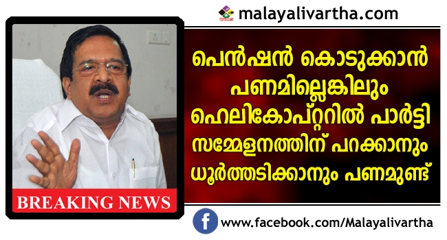 പെന്ഷന് കൊടുക്കാന് പണമില്ലെങ്കിലും ഹെലികോപ്റ്ററില് പാര്ട്ടി സമ്മേളനത്തിന് പറക്കാനും ധൂര്ത്തടിക്കാനും മുഖ്യമന്ത്രിക്കും സര്ക്കാരിനും പണമുണ്ടെന്ന് പ്രതിപക്ഷനേതാവ് രമേശ് ചെന്നിത്തല ആരോപിച്ചു. കെ.എസ്.ആര്.ടി.സി പെന്ഷന് മുടങ്ങിയത് കാരണം സാധുവായ ഒരു വീട്ടമ്മ ആത്മഹത്യ ചെയ്ത ദാരുണ സംഭവമെങ്കിലും സര്ക്കാരിന്റെ കണ്ണ് തുറപ്പിക്കണം.