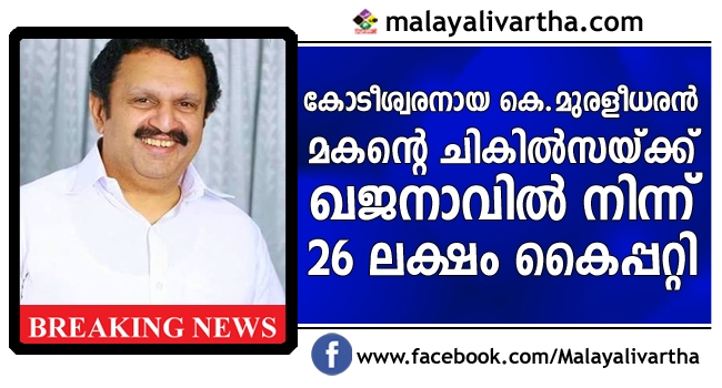 തെരഞ്ഞെടുപ്പ് കമ്മിഷന് നല്കിയ സത്യവാങ്മൂലത്തില് കോടീശ്വരനാണെന്ന് വ്യക്തമാക്കിയ കെ.മുരളീധരന് എം.എല്.എ മകന്റെ ചികില്സയ്ക്കായി പൊതുഖജനാവില് നിന്ന് 26 ലക്ഷത്തോളം രൂപ കൈപ്പറ്റി. ഈ സര്ക്കാരിന്റെ കാലത്താണിത്. 2015-16 വര്ഷം മുരളീധരന്റെ കുടുംബത്തിന്റെ ആസ്തി 13 കോടിയിലേറെയാണ്. ഇപ്പോഴതിലും കൂടും. കോടക്കിണക്കിന് രൂപ സമ്പാദ്യമുള്ളപ്പോള് പാവങ്ങളുടെ നികുതിപ്പണം ഉപയോഗിച്ച് സ്വകാര്യ ആശുപത്രിയിലും മറ്റും ചികില്സനടത്തിയത് ധാര്മികമായി ശരിയല്ലെന്നാണ് രാഷ്ട്രീയനിരീക്ഷകര് വിലയിരുത്തുന്നത്. മുരളീധരന് ഏഴ് കോടി 45 ലക്ഷം രൂപയുടെ ആസ്തിയുണ്ട്. ഭാര്യ ജ്യോതിക്ക് അഞ്ച് കോടി 15 ലക്ഷവും മകന് അരുണ് നാരായണന് 26 ലക്ഷവും മറ്റൊരു മകന് ശബരീനാഥിന് 15 ലക്ഷവും ആസ്തിയുണ്ടെന്നാണ് സത്യവാങ്മൂലത്തില് വ്യക്തമാക്കുന്നത്. രണ്ട് വര്ഷം മുമ്പ് 15 ലക്ഷത്തോളം ആസ്തിയുണ്ടായിരുന്ന മകന്റെ ചികില്സയ്ക്കാണ് 26 ലക്ഷം സര്ക്കാരില് നിന്ന് എഴുതിയെടുത്തത്.