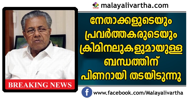 ക്രിമിനല് ബന്ധമുള്ളവരുമായി പാര്ട്ടി നേതാക്കളോ, പ്രവര്ത്തകരോ സഹകരിക്കരുതെന്ന് മുഖ്യമന്ത്രി പിണറായി വിജയന്. അത്തരക്കാര് പാര്ട്ടിയിലേക്ക് കടന്ന് വരാന് പാടില്ല. വന്നാല് മുഖംനോക്കാതെ നടപടിയെടുക്കണം. സി.പി.എം എണാകുളം ജില്ലാ സമ്മേളനത്തിന്റെ ഭാഗമായുള്ള പൊതു ചര്ച്ചയ്ക്ക് മറുപടി പറയുകയായിരുന്നു അദ്ദേഹം. കളമശേരി എര്യാ സെക്രട്ടറിയായിരുന്ന സക്കീര് ഹുസൈനെ പൊലീസ് മനപ്പൂര്വം കള്ളക്കേസില് കുടുക്കിയെന്ന് പ്രതിനിധികളില് ചിലര് ആരോപണം ഉന്നയിച്ചിരുന്നു. ഇതിനുള്ള മറുപടിയായാണ് പിണറായി നയംവ്യക്തമാക്കിയത്. പാര്ട്ടി അധികാരത്തിലേറിയതോടെ പ്രാദേശിക തലത്തിലുള്ള ചില നേതാക്കള്ക്ക് ക്രിമിനല് സംഘങ്ങളുമായി ബന്ധമുണ്ടെന്ന ആക്ഷേപം ശക്തമാണ്.