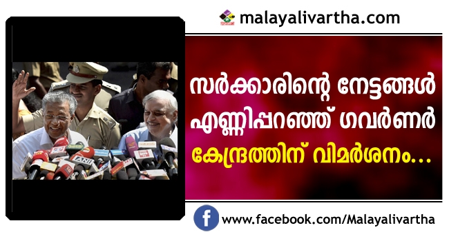 ഇരുപത് മാസത്തെ സംസ്ഥാന സർക്കാരി നേട്ടങ്ങൾ എടുത്ത് പറഞ്ഞും കേന്ദ്ര സർക്കാരിനെ കുറ്റപ്പെടുത്തിയും ഗവർണർ ജസ്റ്റിസ് പി.സദാശിവത്തിന്റെ നയപ്രഖ്യാപന പ്രസംഗം. കേരളത്തിനെതിരെ ദേശിയതലത്തില് കുപ്രചാരണം നടന്നുവെന്നും ഗവര്ണര്. ചില സംഘടനകള് കേരളത്തെ അപകീര്ത്തിപ്പെടുത്താന് ശ്രമിച്ചു. ഇതരസംസ്ഥാന തൊളിലാളികളുടെ ഇടയില് ആശങ്കപടര്ത്താന് ഇവര് ശ്രമിച്ചു.