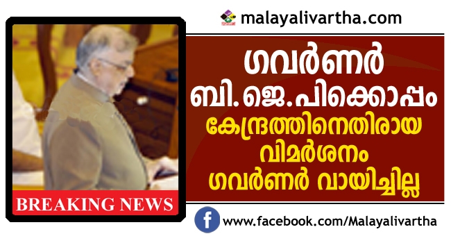 സഹകരണ ഫെഡറിലിസത്തെ അട്ടിമറിക്കാന് കേന്ദ്രസര്ക്കാര് ശ്രമിക്കുന്നെന്ന നയപ്രഖ്യാപന പ്രസംഗത്തിലെ വാചകം ഗവര്ണര് പി.സദാശിവം വായിച്ചില്ല. കേരളത്തില് വര്ഗീയ ലഹളകളില്ല. എന്നിട്ടും കേന്ദ്രസര്ക്കാര് ജില്ലാ ഭരണകൂടത്തെയും തദ്ദേശസ്ഥാപനങ്ങളെയും ഉപയോഗിച്ച് ഫെഡറല് സംവിധാനം അട്ടിമറിക്കാന് ശ്രമിക്കുന്നെന്ന വരിയാണ് ഗവര്ണര് വിട്ടുകളഞ്ഞത്. അച്ചടിച്ച പ്രസംഗത്തില് ഇതുണ്ട് താനും. കേന്ദ്രസര്ക്കാര് നിയമിച്ച ഗവര്ണര് താന് അവര്ക്കൊപ്പമാണെന്ന വ്യക്തമായ സൂചനയാണ് നല്കുന്നതെന്ന വിമര്ശനം ഉയര്ന്നിട്ടുണ്ട്. സാധാരണ ഗവര്ണര്മാര് പ്രസംഗം മുഴുവന് വായിക്കാറില്ലെന്നും ആദ്യത്തെയും അവസാനത്തെയും ഭാഗം മാത്രം വായിച്ച് അവസാനിപ്പിച്ച ചരിത്രമുണ്ടെന്നും മുഖ്യമന്ത്രിയുടെ ഓഫീസ് അറിയിച്ചു. വായിച്ചില്ലെങ്കിലും അച്ചടിച്ച പ്രസംഗമാണ് യഥാര്ത്ഥ നയപ്രഖ്യാപനമെന്നും മുഖ്യമന്ത്രിയുടെ ഓഫീസ് അറിയിച്ചു.