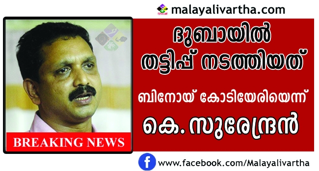 ദുബയില് കോടികളുടെ തട്ടിപ്പ് നടത്തിയ ശേഷം മുങ്ങിയത് സി.പി.എം സംസ്ഥാന സെക്രട്ടറി കോടിയേരി ബാലകൃഷ്ണന്റെ മൂത്ത മകന് ബിനോയ് കോടിയേരിയാണെന്ന് ബി.ജെ.പി സംസ്ഥാന ജനറല് സെക്രട്ടറി കെ.സുരേന്ദ്രന് വെളിപ്പെടുത്തി. പരാതിയെ കുറിച്ച് വാര്ത്ത പുറത്ത് വന്നതോടെ മാതൃഭൂമി ചാനല് പ്രതികരണത്തിനായി വിളിച്ചപ്പോഴാണ് സുരേന്ദ്രന് കോടിയേരിയുടെ മകന്റെ പേരും പങ്കും വ്യക്തമാക്കിയത്. നിങ്ങള് പ്രമുഖ നേതാവിന്റെ മകനെന്ന് പറയണ്ട, കോടിയേരി ബാലകൃഷ്ണന്റെ മകന് ബിനോയിയാണ് തട്ടിപ്പ് നടത്തിയ മുങ്ങിയതെന്ന് സുരേന്ദ്രന് പറഞ്ഞു. ബിനോയ് കോടിയേരിയല്ല തട്ടിപ്പ് നടത്തിയതെന്ന് സി.പി.എമ്മിന് പറയാതിരിക്കാന് കഴിയുമോ എന്നും സുരേന്ദ്രന് ചോദിച്ചു. കമ്പനി