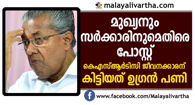 മുഖ്യമന്ത്രിക്കെതിരെ പോസ്റ്റിട്ട സര്ക്കാര് ജീവനക്കാരന് കിട്ടിയത് ഉഗ്രൻ പണി; വ്യാജ ഫെയ്സ്ബുക്ക് പ്രൊഫൈല് ഉപയോഗിച്ച് കെഎസ്ആര്ടിസി ഡിപ്പോയിലെ ഡ്രൈവർ മുഖ്യനും സര്ക്കാരിനുമെതിരെ പോസ്റ്റിട്ടത്...