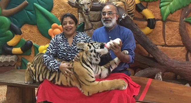 വീണ്ടും സോഷ്യൽ മീഡിയയിൽ താരങ്ങളായി കണ്ണന്താനവും ഭാര്യയും ;കടുവയെ മടിയിലിരുത്തി പാല് കൊടുക്കുന്ന ഫോട്ടോസ് സോഷ്യൽ മീഡിയയിൽ വൈറൽ