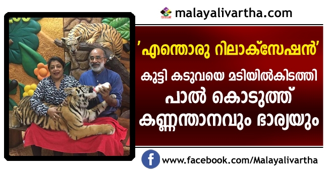 കുട്ടി കടുവയെ മടിയില്കിടത്തി പാല് കൊടുത്ത് കേന്ദ്രടൂറിസം മന്ത്രി അല്ഫോണ്സ് കണ്ണന്താനത്തിന്റെയും ഭാര്യയുടെയും സാഹസികത