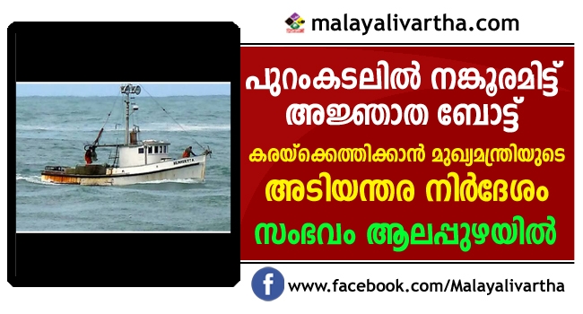 ഒന്നര മാസത്തിലേറെയായി നങ്കൂരമിട്ടു കിടക്കുന്ന അജ്ഞാത മത്സ്യബന്ധന ബോട്ട് ആലപ്പുഴ പുറംകടലിൽ; കരയ്ക്കെത്തിക്കാന് മുഖ്യമന്ത്രിയുടെ അടിയന്തര നിര്ദേശം