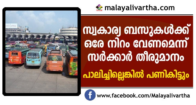 സംസ്ഥാനത്ത് സ്വകാര്യ ബസുകള്ക്ക് ഇനി ഒരേ നിറം ; ഒരു വർഷം കൊണ്ട് പദ്ധതി പൂർത്തിയാകും