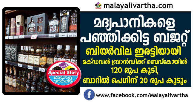 സംസ്ഥാനത്ത് മദ്യവില കുത്തനെ വര്ദ്ധിക്കും. ബജറ്റില് നികുതി വര്ദ്ധിപ്പിച്ചതോടെയാണ് മദ്യപാനികള്ക്ക് ഇരുട്ടടിയായത്. ബിവറേജസ് ഔട്ട്ലെറ്റ് വഴി മദ്യം വാങ്ങുന്ന സാധാരണ കുടിയന്മാരെ കാത്തിരിക്കുന്നത് ദുരിതകാലമാണ്. 400 രൂപ വരെ വിലയുള്ള മദ്യത്തിന് 200 ശതമാനം വില്പ്പന നികുതി ഏര്പ്പെടുത്തി. അതോടെ 800 രൂപയാകും. 400 രൂപയ്ക്ക് മുകളിലുള്ള മദ്യത്തിന് 210 ശതമാനം നികുതിയാണ് ചുമത്തിയിരിക്കുന്നത്. അതായത് 400 രൂപയുടെ മദ്യത്തിന് 840 രൂപ നല്കണം. ബിയറിന് 100 ശതമാനം നികുതിയാക്കി. ബിവറേജസ് ഔട്ട്ലെറ്റില് മക്ഡവല് ബ്രാണ്ടിക്ക് 120 രൂപ കൂടും. ബാറില് ഈ ബ്രാന്ന്റിന് പെഗിന് 20 രൂപയും ഫുള് ബോട്ടിലിന് 250 രൂപയും വര്ദ്ധിക്കും. അതേസമയം വിദേശമദ്യത്തിന്റെ ഇറക്കുമതി ടാക്സ് തോമസ് ഐസക് കുറച്ചിട്ടുമുണ്ട്. സാമ്രാജ്യത്വ താല്പര്യങ്ങള് സംരക്ഷിക്കുകയാണ് ഐസക്ക് ഇതിലൂടെ ചെയ്തതെന്ന് സാധാരണ മദ്യപാനികള് ആക്ഷേപിക്കുന്നു. തങ്ങള്ക്ക് ചോദിക്കാനും പറയാനും ആരും ഇല്ലാത്തത് കൊണ്ടാണ് എല്ലാ ബജറ്റിലും മദ്യത്തിന്റെ നികുതി കുത്തനെ കൂട്ടുന്നതെന്നും ഇവര് ചൂണ്ടിക്കാട്ടി.