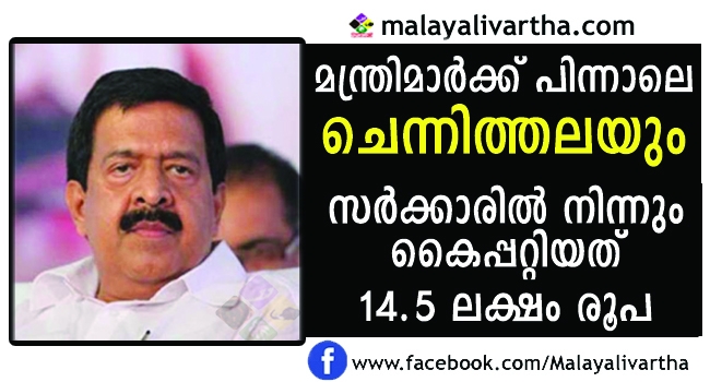 സര്ക്കാര് ആനുകൂല്യങ്ങള് കൈപ്പറ്റി വിവാദത്തിലായ മന്ത്രിമാർക്ക് പിന്നാലെ രമേശ് ചെന്നിത്തലയും ; സര്ക്കാരില് നിന്നും കൈപ്പറ്റിയത് 14.5 ലക്ഷം രൂപ