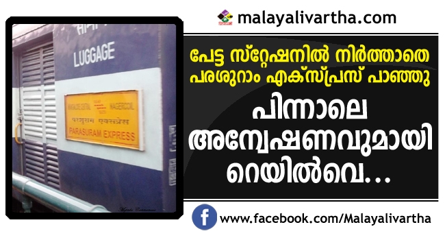 തിരുവനന്തപുരം പേട്ട സ്റ്റേഷനില് നിർത്താതെ പരശുറാം എക്സ്പ്രസ് നിർത്തിയത് പ്ലാറ്റ്ഫോം ഇല്ലാത്ത ഭാഗത്ത്... അന്വേഷണവുമായി റെയില്വെ