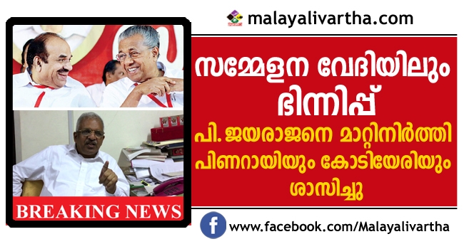 സംസ്ഥാന സമ്മേളന വേദിയിലും കണ്ണൂര് സി.പി.എമ്മിലെ നേതാക്കള് തമ്മിലുള്ള ഭിന്നത രൂക്ഷം. തൃശൂരില് ഇന്ന് രാവിലെ സമ്മേളനം തുടങ്ങും മുമ്പ് സംസ്ഥാന സെക്രട്ടറി കോടിയേരി ബാലകൃഷ്ണനും മുഖ്യമന്ത്രി പിണറായി വിജയനും പി. ജയരാജനെ വേദിക്കരികിലേക്ക് വിളിച്ചുവരുത്തി ശാസിച്ചു. ഷുഹൈബ് വധത്തില് പൊലീസ് അന്വേഷണത്തില് വിശ്വാസമില്ലെന്നും സംഭവത്തെ കുറിച്ച് ജില്ലാ കമ്മിറ്റി അന്വേഷിക്കുമെന്നുള്ള സെക്രട്ടറി പി.ജയരാജന്റെ പ്രസ്താവനയെ തുടര്ന്നാണിത്. പൊലീസിനെതിരായ വിമര്ശനം ശരിയായില്ലെന്ന് പിണറായിയും കോടിയേരിയും അറിയിച്ചു. കൊലപാതകത്തെ തുടര്ന്ന് പാര്ട്ടി പ്രതിസന്ധിയിലായിരിക്കുമ്പോള് സര്ക്കാരിനെ കൂടെ വെട്ടിലാക്കി നടത്തിയ പ്രസ്താവന അനവസരത്തിലുളളതായിരുന്നെന്നാണ് വിലയിരുത്തല്. പി.ജയരാജന്റെ പ്രസ്താവനയ്ക്ക് പിന്നാലെ കോടിയേരി പര്യമായി രംഗത്തെത്തിയിരുന്നു. അന്വേഷണച്ചുമത പൊലീസിനാണെന്നും പാര്ട്ടിക്കല്ലെന്നും കോടിയേരി പി.ജയരാജനെ തിരുത്തിയിരുന്നു.