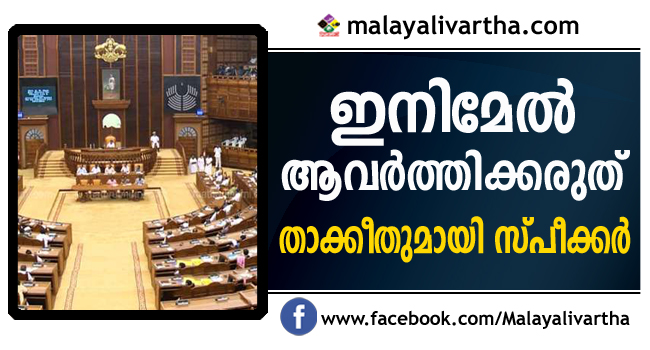 നിയമസഭയുടെ അന്തസ് കെടുത്തുന്ന പ്രവര്ത്തനമാണ് പ്രതിപക്ഷത്തിന്റെ ഭാഗത്ത് നിന്നുണ്ടായത്; പ്രതിഷേധിക്കാനുള്ള അവകാശം പ്രതിപക്ഷത്തിനുണ്ട്; ചെയറിന്റെ മുഖം മറച്ചത് അന്തസിന് ചേര്ന്നതല്ല; ഇനിയിത് ആവര്ത്തിക്കരുതെന്ന് സ്പീക്കറുടെ താക്കീത്