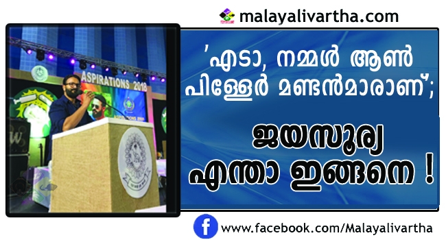 സേ നോട്ട് റ്റു ഡ്രഗ്സ് സന്ദേശവുമായി കേരള പൊലീസിന്റെ ലഹരി വിരുദ്ധ പ്രചാരണമായ ആസ്പിരേഷന് ഉദ്ഘാടനവേദിയിൽ താരമായി നടന് ജയസൂര്യ. സദസിനെ ആവേശം കൊള്ളിക്കാൻ ജയസൂര്യയുടെ വാക്കുകൾ ധാരാളം. ലഹരി വില്പന ഒഴിവാക്കാന് കഴിഞ്ഞില്ലങ്കില് പിന്നെ നമ്മുക്കു മുന്നില് ഒന്നേ ഉള്ളൂ അത് അങ്ങ് വേണ്ടെന്നു വയ്ക്കുക. ജീവിതത്തില് യെസ് എന്നു പറയുന്നതിനെക്കാള് നല്ലത് നോ എന്നു പറയുന്നതാണ് എന്ന് ജയസൂര്യ പറഞ്ഞു.