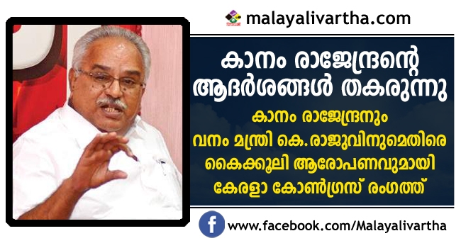 സി.പി.ഐ സംസ്ഥാന സെക്രട്ടറി കാനം രാജേന്ദ്രനും വനം മന്ത്രി കെ.രാജുവിനുമെതിരെ കൈക്കൂലി ആരോപണവുമായി കേരളാ കോണ്ഗ്രസ് രംഗത്ത്. കോട്ടയം - പത്തനംതിട്ട അതിര്ത്തിയിലെ വനമേഖലയായ പൊന്തന്പുഴ സ്വകാര്യ വ്യക്തികള്ക്ക് കൈമാറുന്നത് സംബന്ധിച്ച കേസ് തോറ്റു കൊടുക്കാന് കാനവും മന്ത്രി രാജുവും ഏഴ് കോടി രൂപ കൈക്കൂലി വാങ്ങിയെന്നാണ് കേരളാ കോണ്ഗ്രസ് സ്റ്റിയറിംഗ് കമ്മിറ്റി അംഗം സ്റ്റീഫന് ജോര്ജ് ആരോപിച്ചത്. കേസ് തോറ്റതിനെ കുറിച്ചുള്ള അന്വേഷണത്തിന് മുഖ്യമന്ത്രി പിണറായി വിജയന് തയ്യാറാവണമെന്നും സ്റ്റീഫന് ജോര്ജ് ആവശ്യപ്പെട്ടു. കേരളാ കോണ്ഗ്രസിനെ ഇടതുമുന്നണിയില് എടുക്കുന്നതിനെ ശക്തമായി കാനം എതിര്ക്കുന്നതിനിടെയാണ് അദ്ദേഹത്തിനെതിരെ ആരോപണം ഉന്നയിച്ചിരിക്കുന്നതെന്നത് ശ്രദ്ധേയമാണ്.