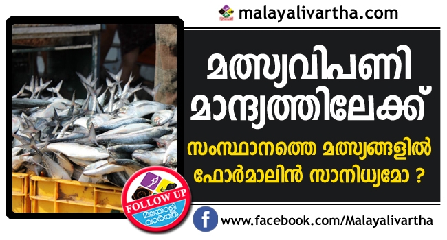 ഫോര്മലിൻ ഭീതിയിൽ പ്രതിസന്ധിയിലായി സംസ്ഥാനത്തെ മത്സ്യ വിപണി. ഫോര്മലിൻ കലര്ന്ന മീൻ കേരളത്തിലേക്കെത്തുന്ന സാഹചര്യത്തില് സംസ്ഥാനത്തെ മത്സ്യവിപണി മാന്ദ്യത്തിലായിരുന്നു. വാർത്തകളെ തുടർന്ന് ജനങ്ങൾ മീൻ വാങ്ങാതായതോടെ പരമ്പരാഗത വള്ളങ്ങളില് പിടിക്കുന്ന മീനിന് രണ്ടിരട്ടി വരെ വില കുറഞ്ഞു.