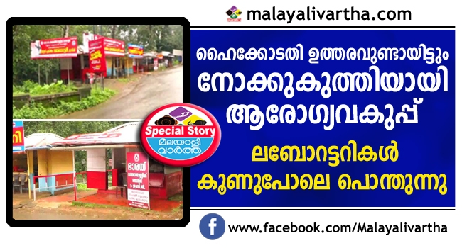 അശാസ്ത്രീയമായ വിധം പ്രവർത്തിക്കുന്ന ലബോറട്ടറികൾ പൂട്ടാൻ ഹൈക്കോടതി ഉത്തരവുണ്ടായിട്ടും ആരോഗ്യ വകുപ്പ് മേധാവികൾ നടപടിയെടുക്കുന്നില്ലന്ന് ആരോപണം. ഇടുക്കി മെഡിക്കൽ കോളേജിന് മുൻഭാഗത്താണ് ഇന്ത്യൻ മെഡിക്കൽ കൗൺസിൽ റിസേർച്ച് വിഭാഗത്തിന്റെ മാനദണ്ഡങ്ങൾ ഒന്നും പാലിക്കാതെ ലബോറട്ടറികൾ പ്രവർത്തിക്കുന്നത്.
